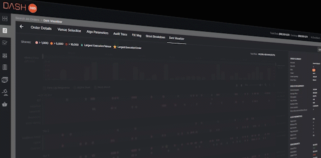Bring the dark to light! View how our highly customizable, dark equity algorithm navigates venue groups at different times, following the parameters set by the user. Quickly distinguish the success of enhanced price and volume-based features such as alpha-seek and block-react, and dive into the performance versus the benchmark of your choice.